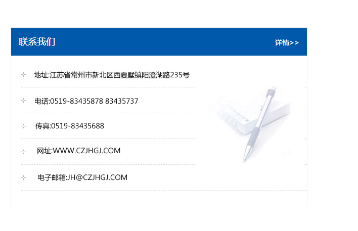 地址:常州市新北區友邦商務大廈1幢16、17層  電話:0519-85101652  傳真:0519-85112595  郵編:213022  網址:www.cz-jiayue_cn.027mg.com  郵箱:xiajifengaa@163.com